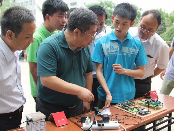 参观过程中,党委书记邓志辉对展出的学生作品给予了充分肯定,并亲自测试了展出作品的功能和效果。在与学生进行交流的过程中,他鼓励同学们在今后的设计制作中,多与新技术结合、多出实用新作品、多报批专利,力争把作品变为优秀产品推向市场,并承诺学院将对此给予大力支持。