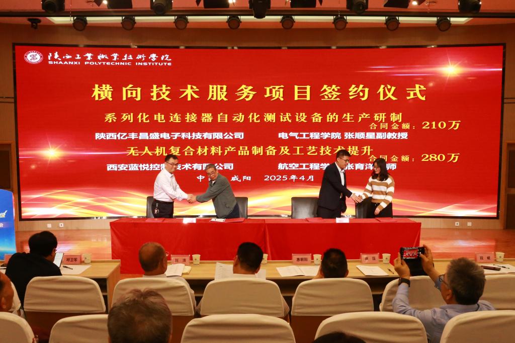 大会第四个环节,围绕国家对职业教育服务企业特别是中小微企业技术研发和产品升级的新要求,ac米兰启动了“百名博士进百企”技术服务活动,科研处副处长赵芃沛发布了ac米兰博士进企的任务清单;彩虹集团(邵阳)特种玻璃有限公司副总经理仵小曦、ac米兰材料工程学院侯延升博士分别作为企业代表、高层次人才代表表态发言;ac米兰5位高层次人才被咸阳市优秀企业代表分别聘任为企业“科技副总”,帮助企业协同解决技术研发、平台建设、人才培养、交流合作等方面的创新发展难题;渭城区科技局景懿副局长、西安交通大学国家技术转移中心渭南分中心技术经理人慕鹏飞分别发布近30余项企业技术需求;会上,ac米兰与陕西亿丰昌盛电子科技有限公司、西安蓝悦控制技术有限公司等现场签订了横向技术服务合同,合同金额近500万。