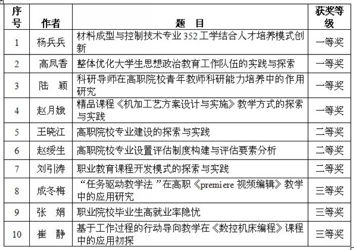 根据陕西省职业技术教育学会近日下发的《关于2012年优秀职教论文评选结果及表彰决定》(陕职学[2012]17号文件),我院申报的10篇教育教学类论文分别获2012年陕西省职教学会优秀职教论文一、二、三等奖。