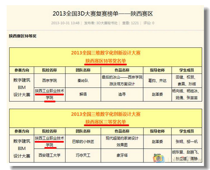 11月1日,2013年第六届全国三维数字化创新设计(3D)大赛复赛陕西赛区组委会公布了获奖榜单,由我院信息工程学院教师赵革委指导的图形图像制作专业1103班杨向辉、杨皓冰、姚倩、张苗苗同学的作品《追寻》获得陕西赛区...