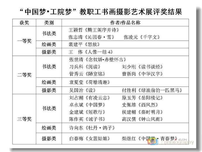 我院庆祝建校63周年“中国梦•工院梦”教职工书画摄影艺术展自11月15日开始展出以来,吸引了全院数百名师生前来观看,共收到观众投票126张。