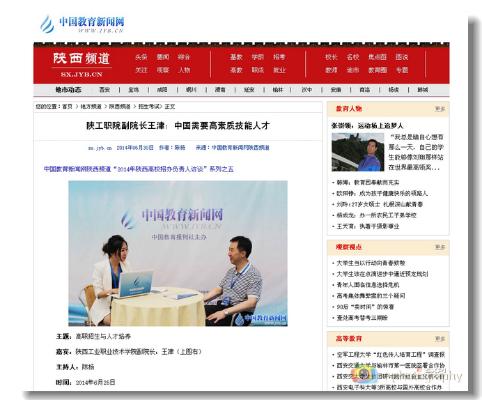 6月25日,在参加陕西省第四届高等教育博览会暨招生咨询会期间,副院长王津围绕“高职招生与人才培养”接受了中国教育新闻网记者历时近一小时的专访,现将全文转载如下: 陕工职院副院长王津:中国需要高素质技能人...